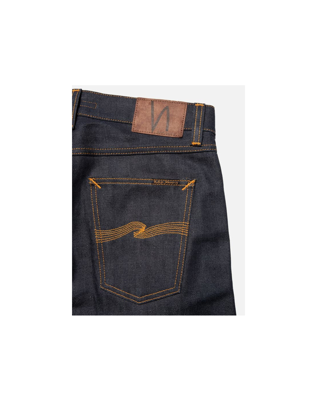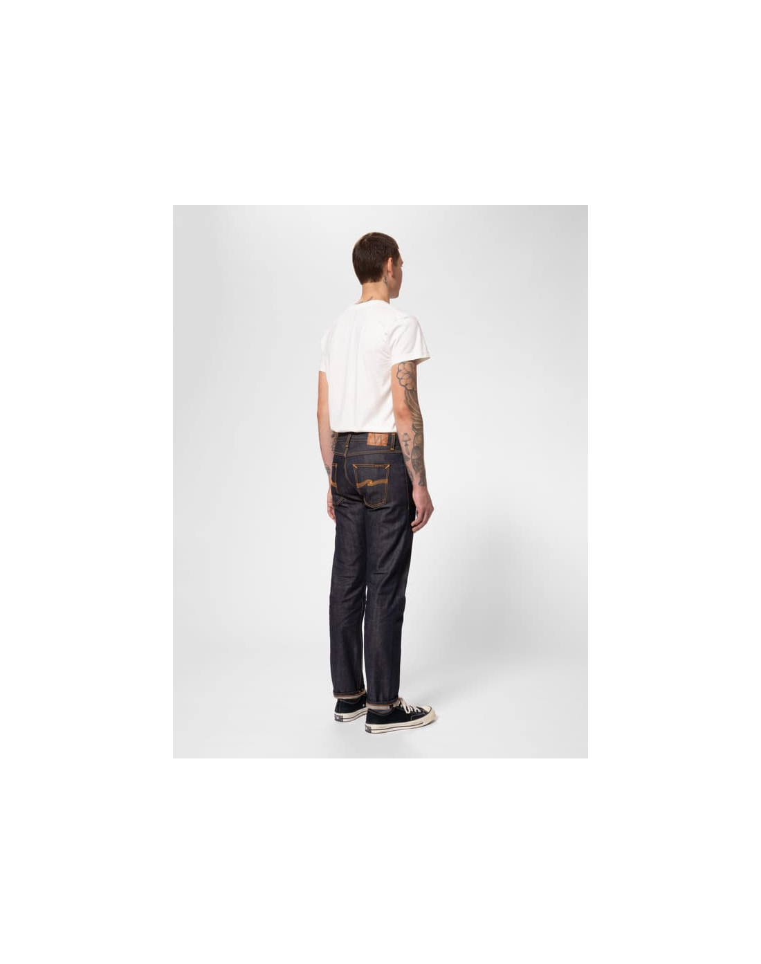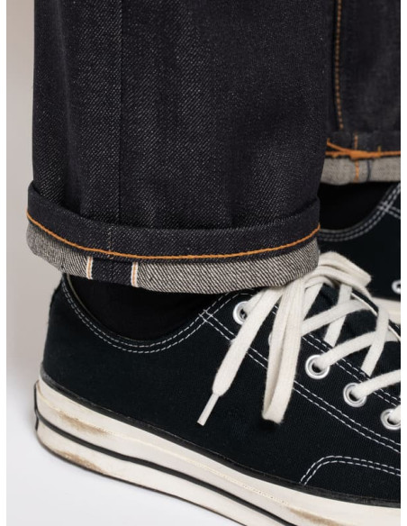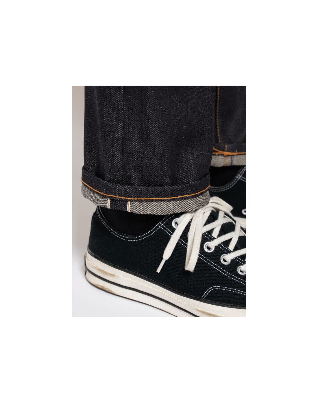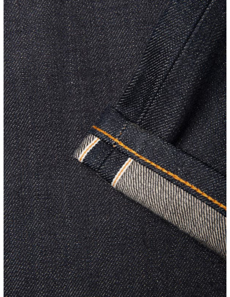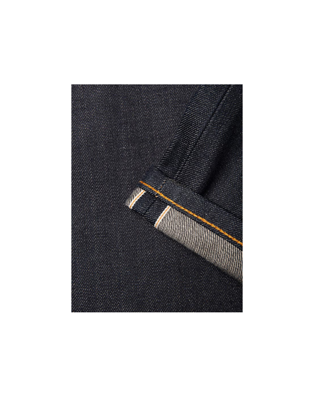 Algodón orgánico Mezclilla rígida de 14,15 oz. Mezclilla de color rojo Hilo de tabaco en las costuras Bordado índigo en el bolsillo trasero Adornos de cobre Bragueta con cremallera Parche de Jacron Ajuste regular cintura media Pierna recta Apertura de pierna regular