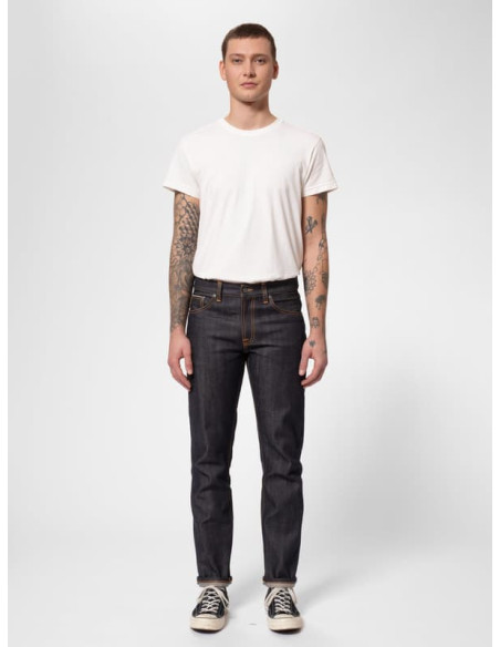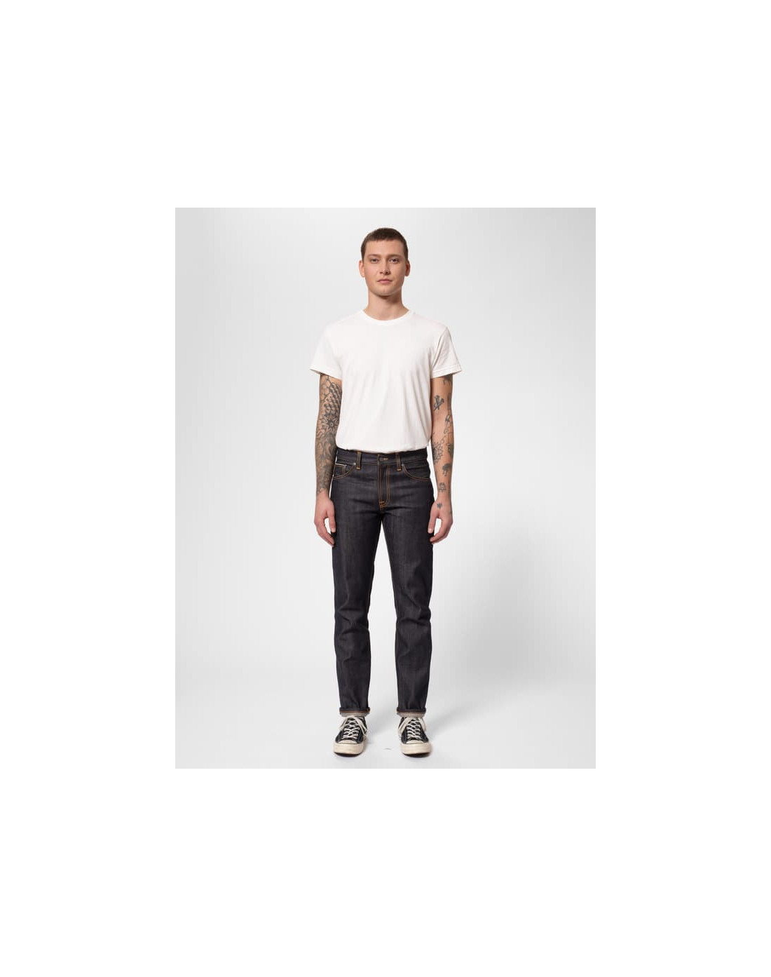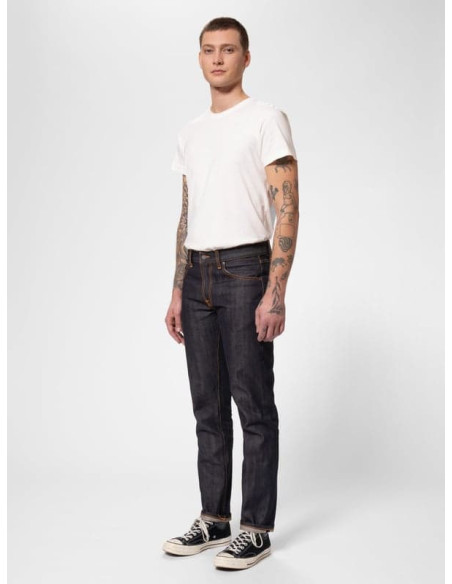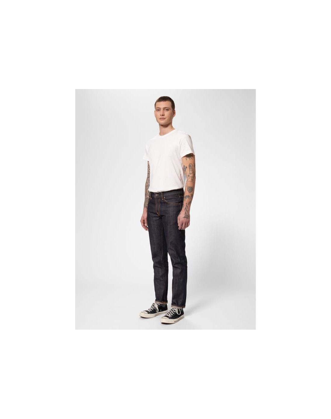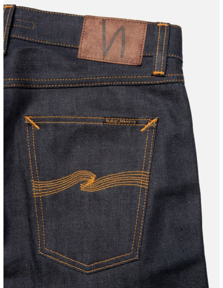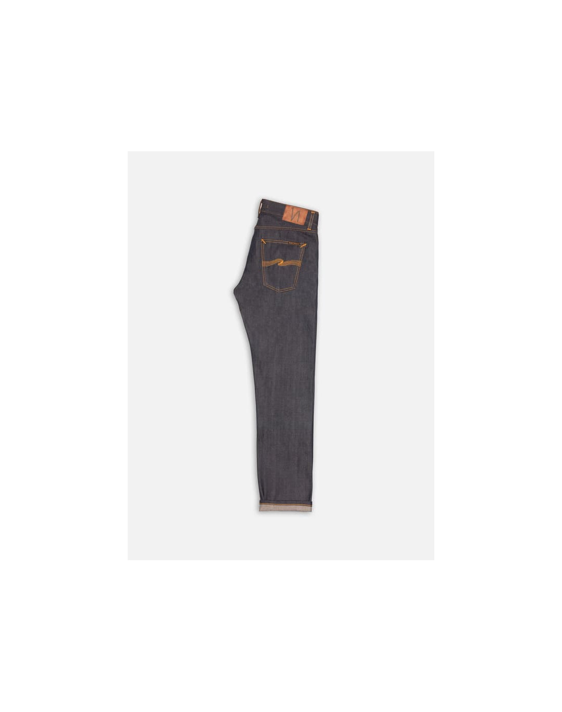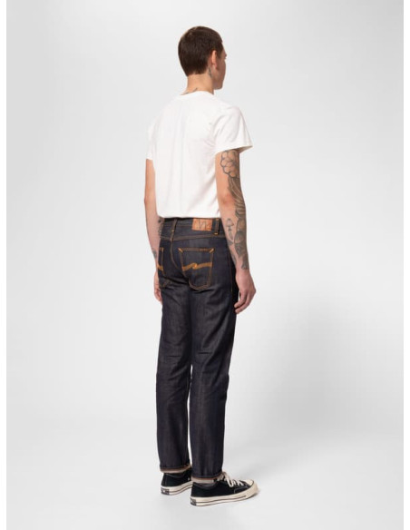 Algodón orgánico Mezclilla rígida de 14,15 oz. Mezclilla de color rojo Hilo de tabaco en las costuras Bordado índigo en el bolsillo trasero Adornos de cobre Bragueta con cremallera Parche de Jacron Ajuste regular cintura media Pierna recta Apertura de pierna regular