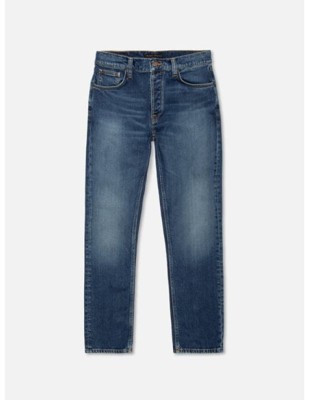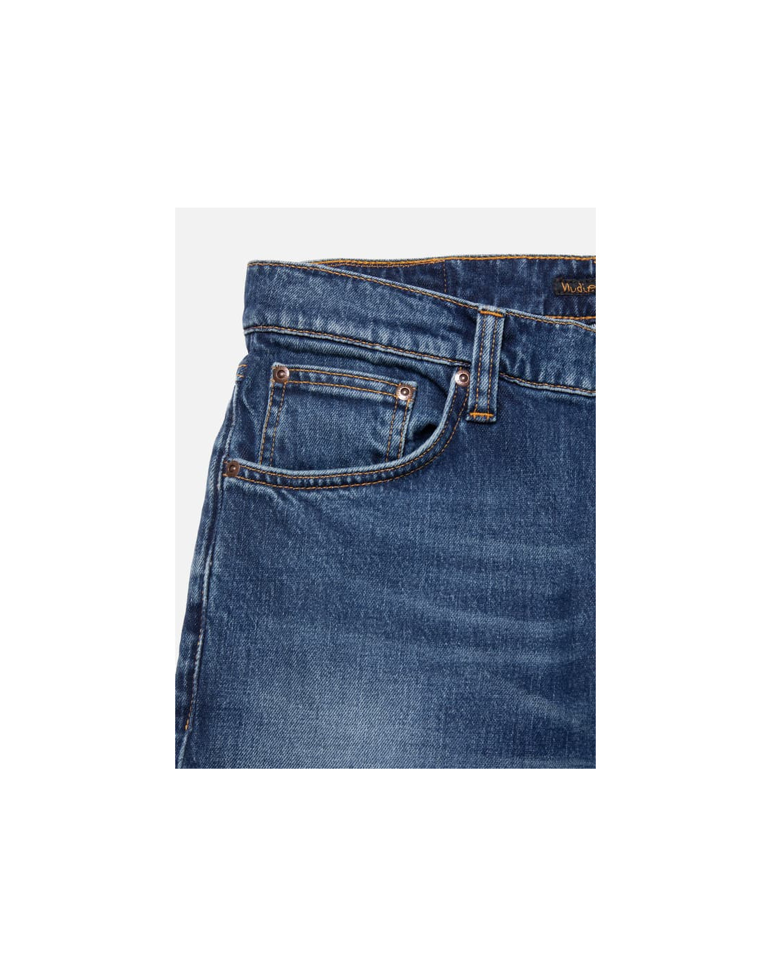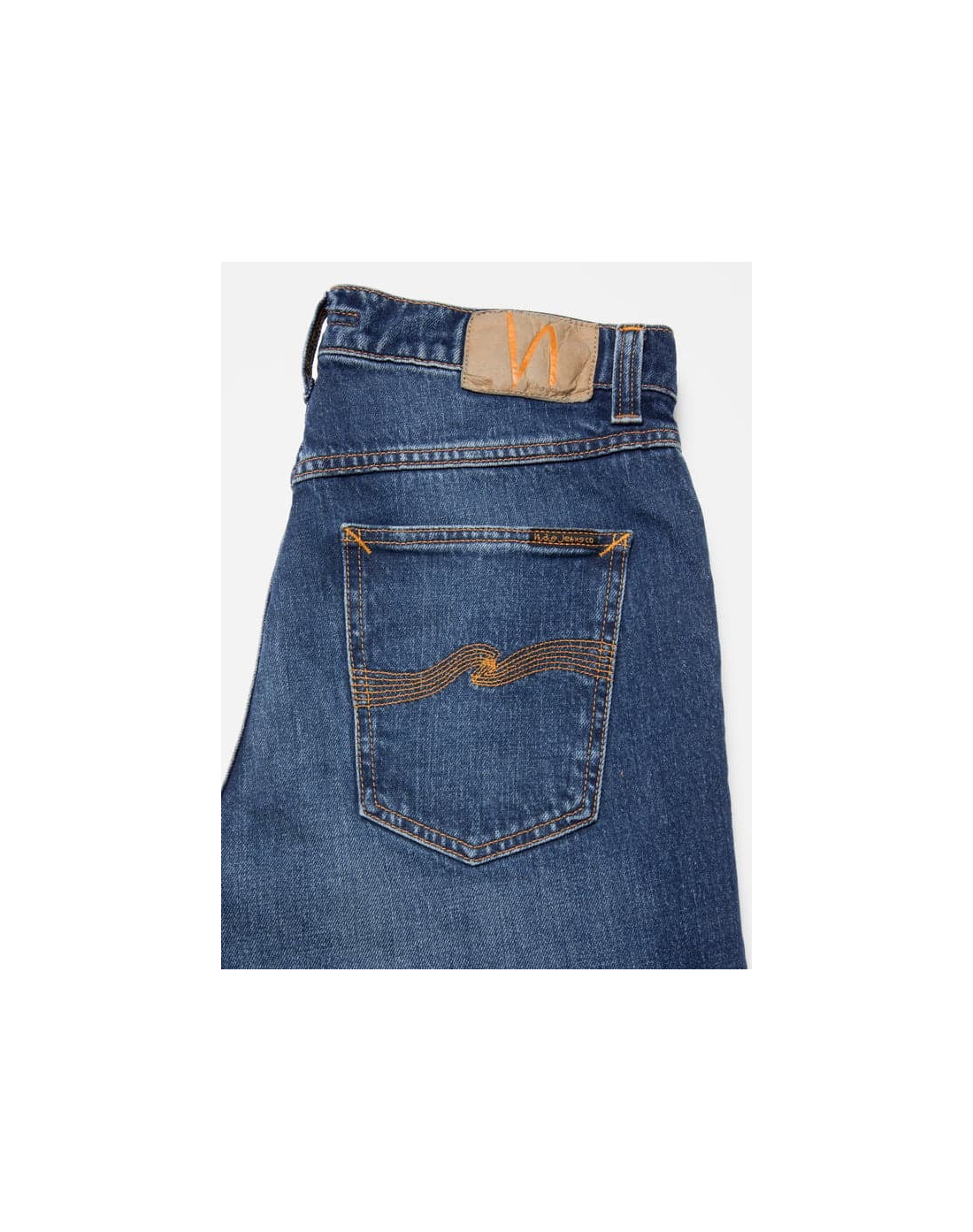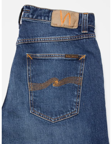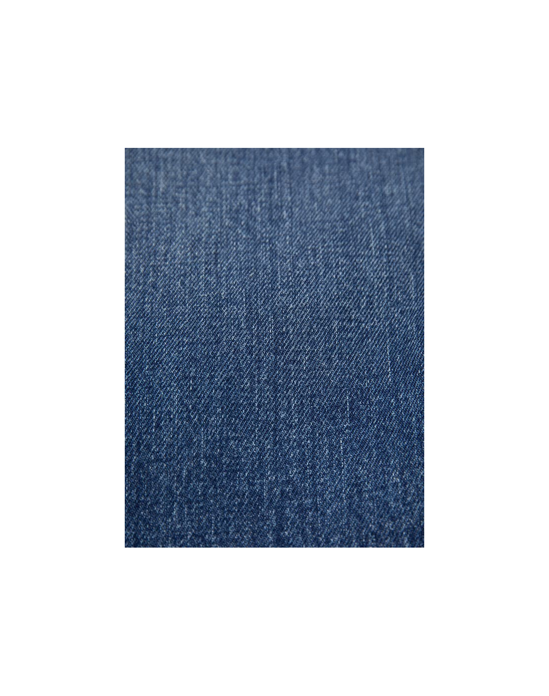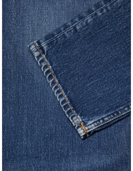 Algodón orgánico Mezclilla elástica cómoda de 13 oz. Hilo naranja en las costuras Adornos de cobre Bragueta de botón Parche de Jacron Ajuste ajustado Cintura media Pierna delgada Abertura de pierna delgada