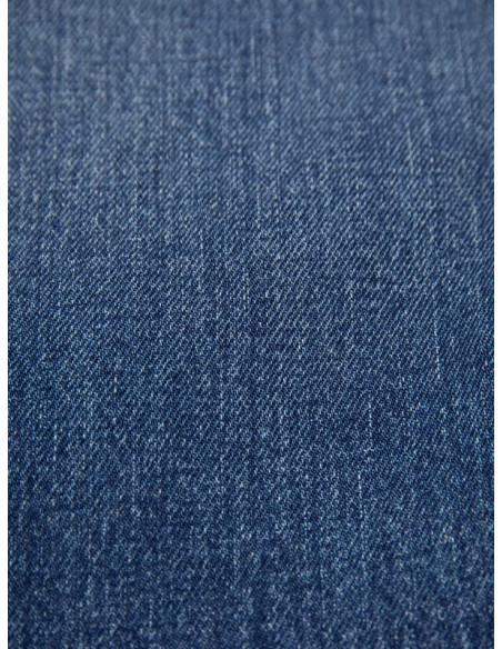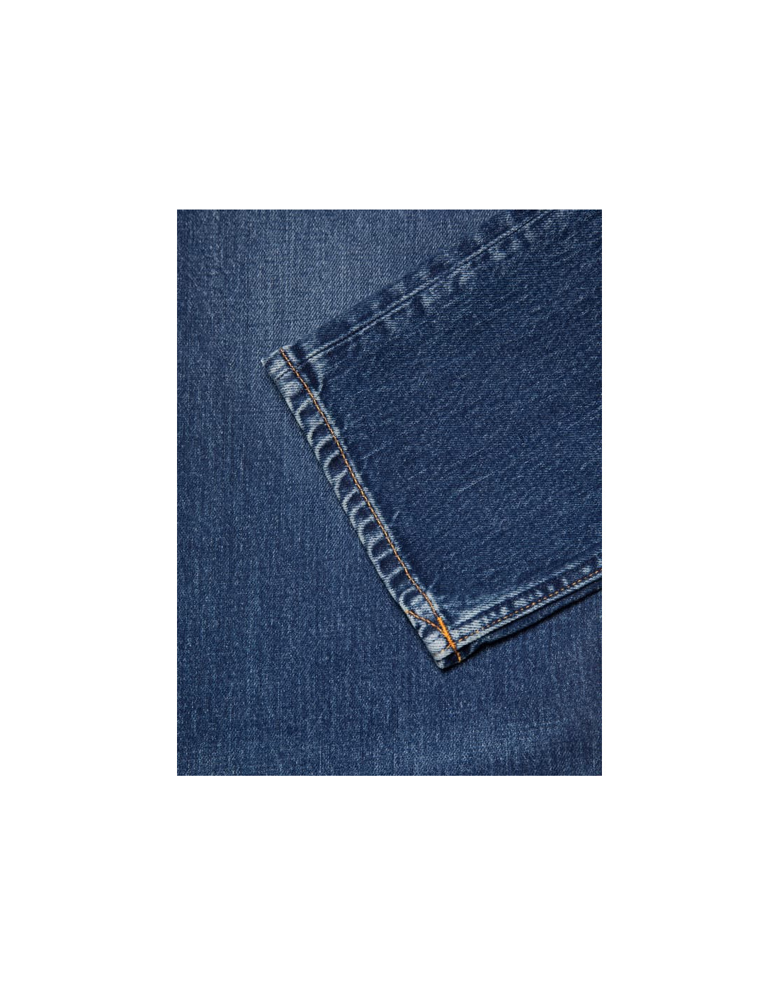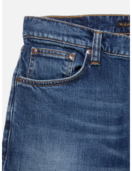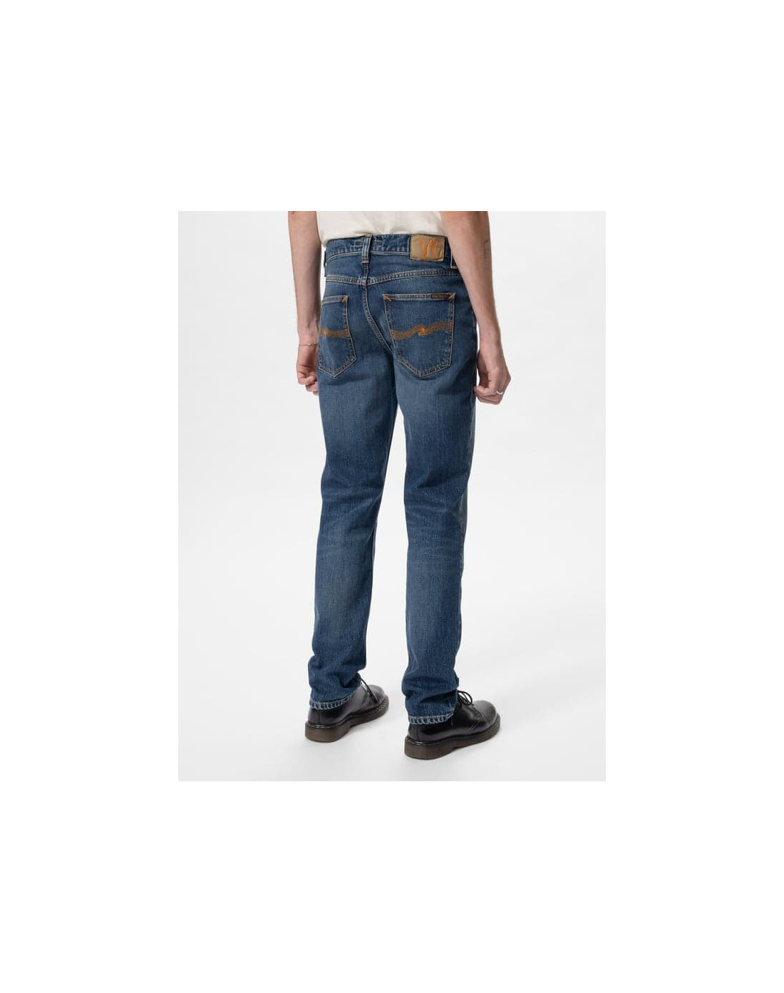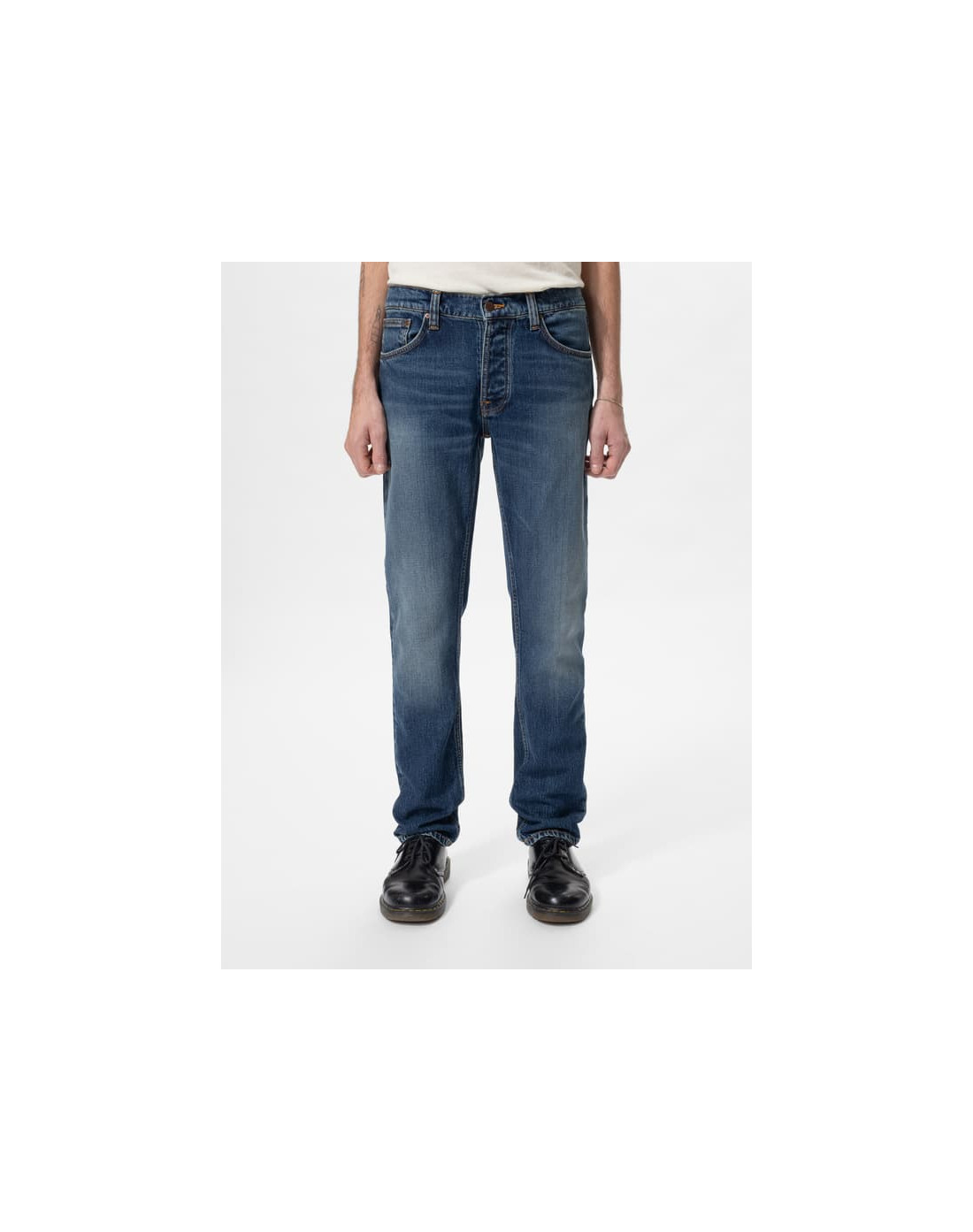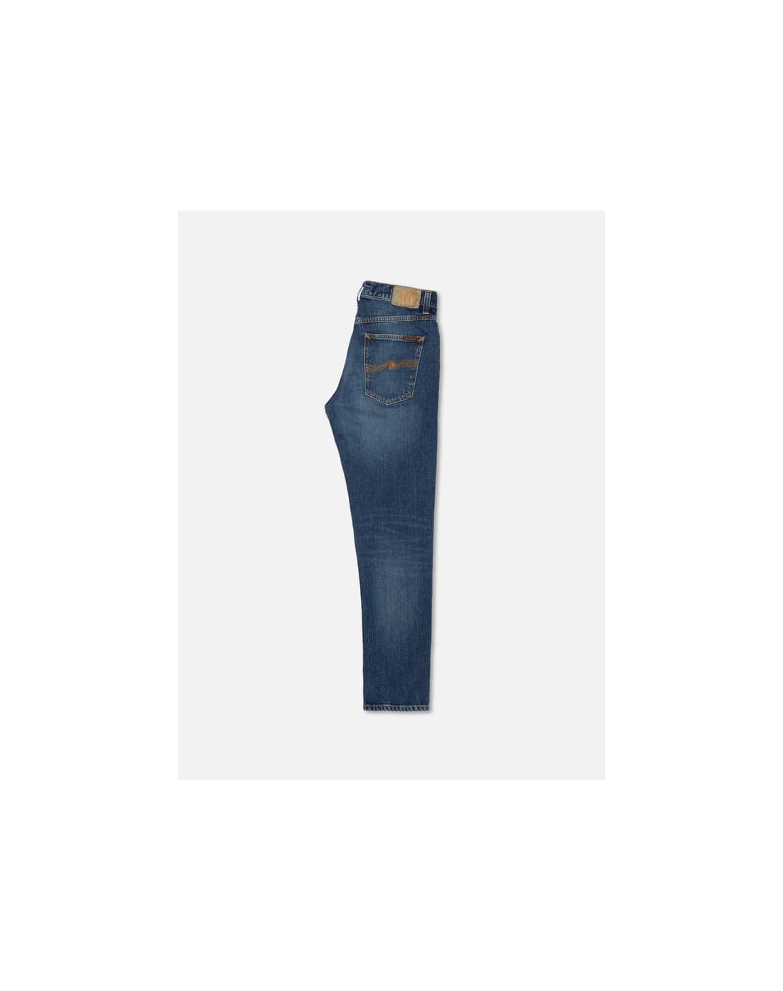 Algodón orgánico Mezclilla elástica cómoda de 13 oz. Hilo naranja en las costuras Adornos de cobre Bragueta de botón Parche de Jacron Ajuste ajustado Cintura media Pierna delgada Abertura de pierna delgada