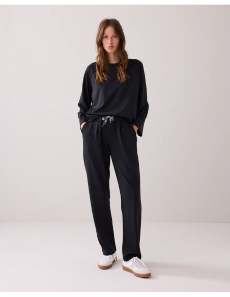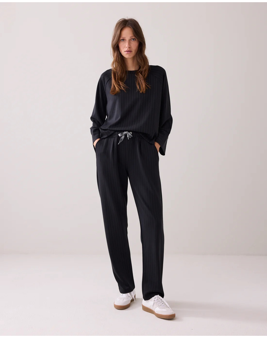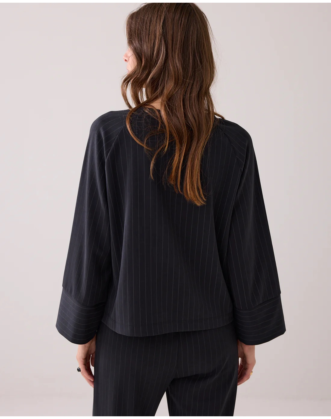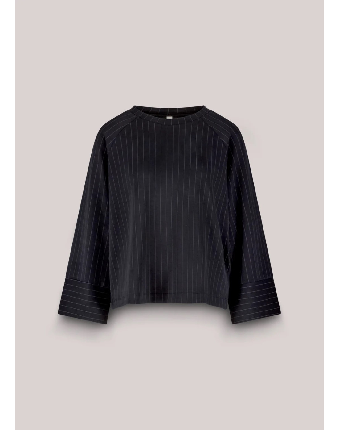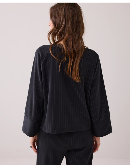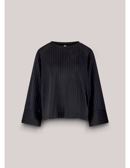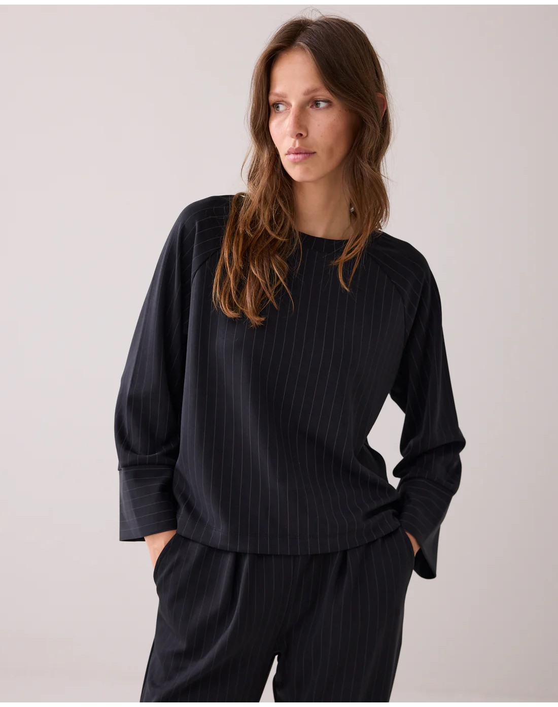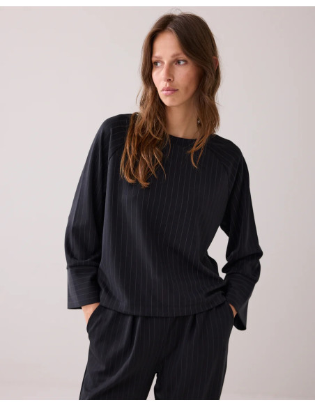 Esta cómoda camiseta está confeccionada en un suave tejido de neopreno con raya diplomática. Tiene un corte cuadrado, cuello redondo y amplio, mangas raglán largas y puños con rayas horizontales.