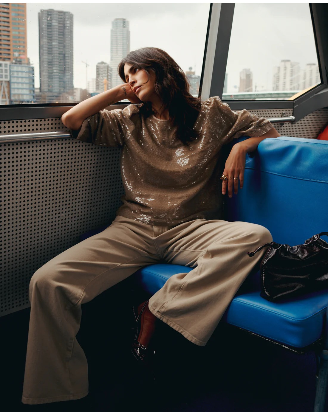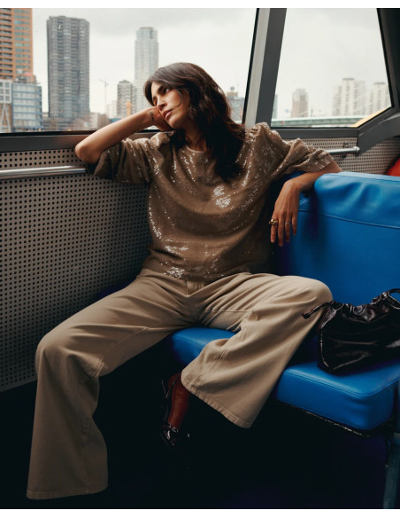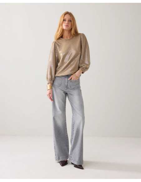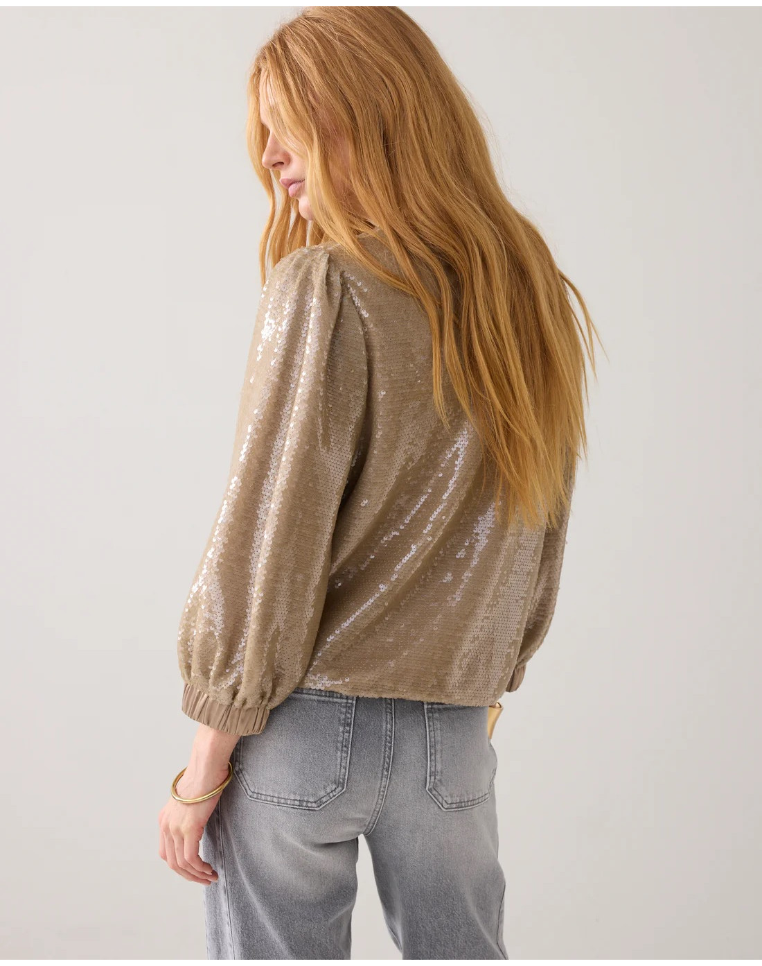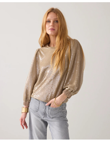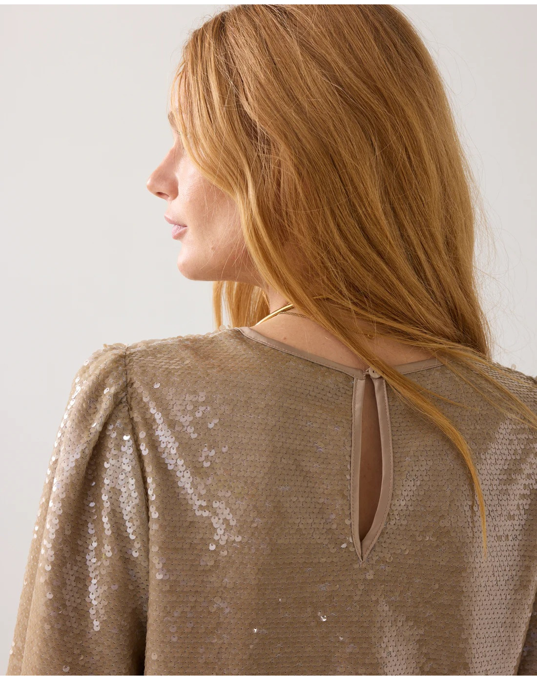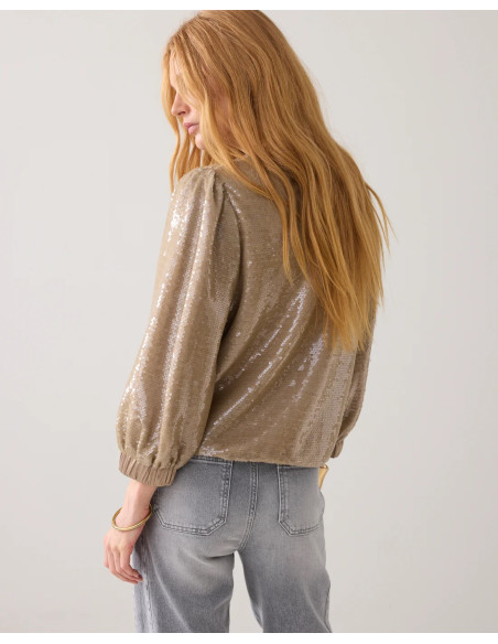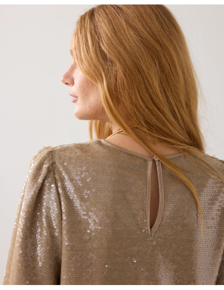 • Tela de lentejuelas • Ribete de satén en el cuello • Bajo y puños fruncidos • Corte amplio con ligero efecto abullonado