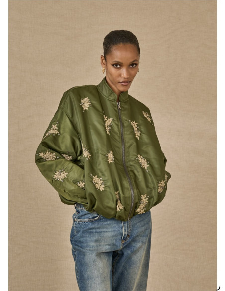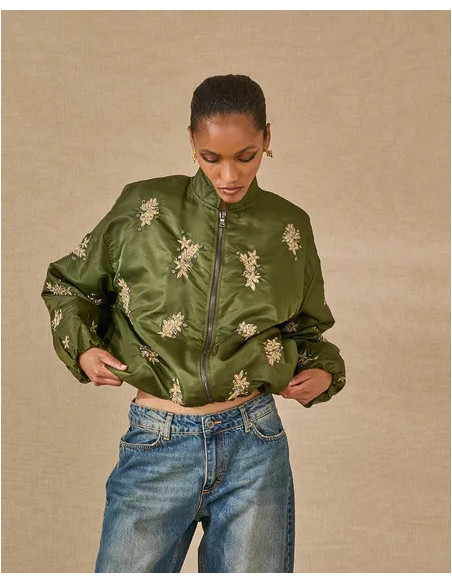 Cazadora tipo bomber Souvenir. Bolsillos y cierre con cremallera en la parte delantera. Detalle de bordados en color rojo.