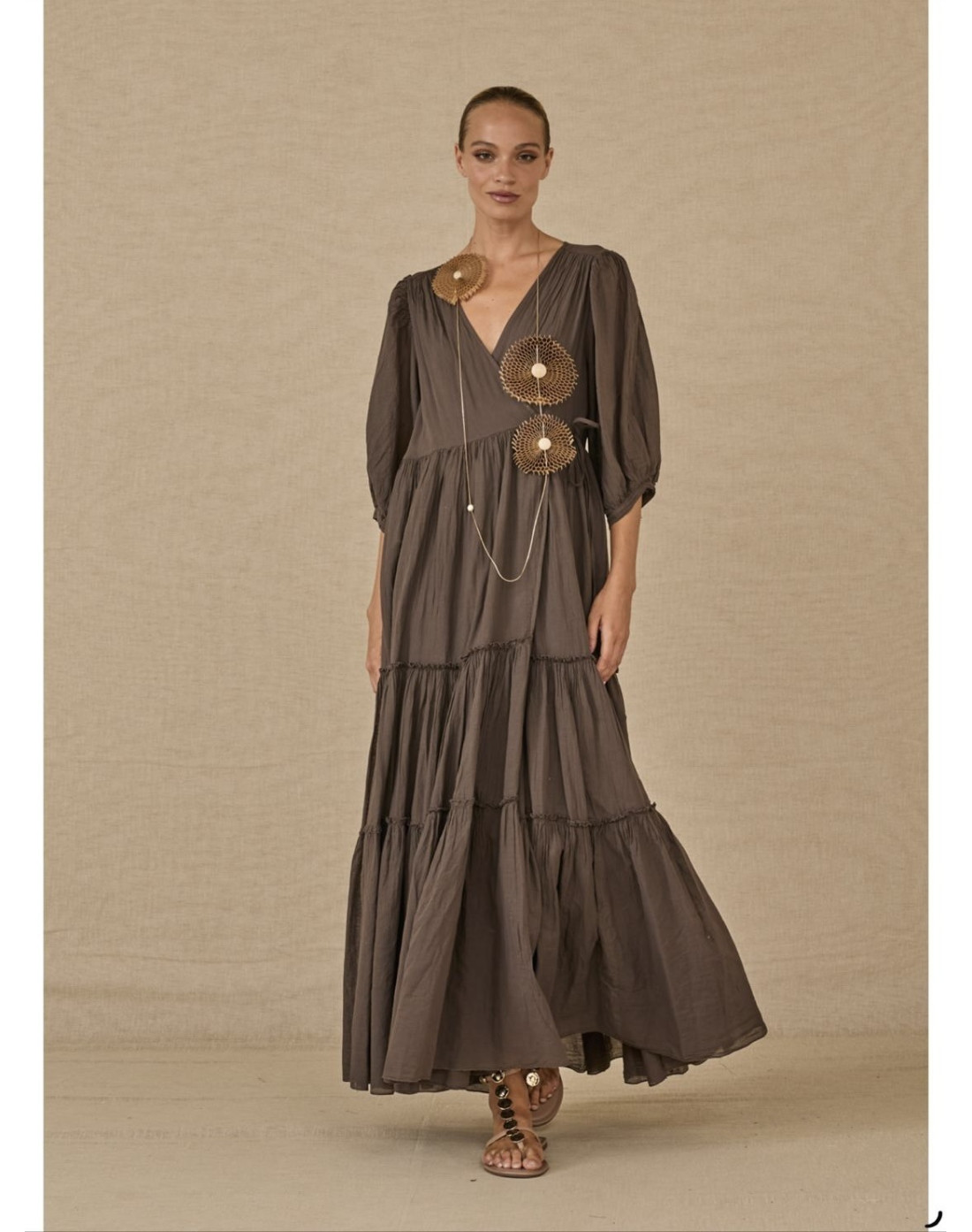 Vestido largo de estilo bohemio y fluido, caracterizado por su silueta escalonada y un tono marrón chocolate intenso.
