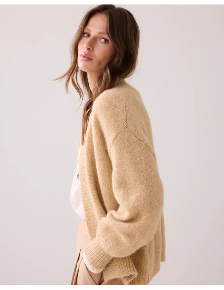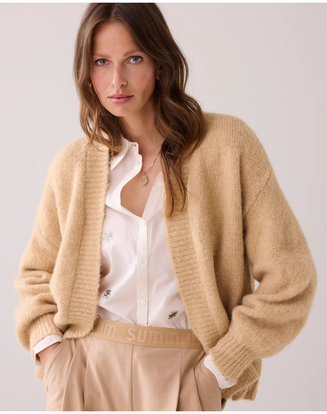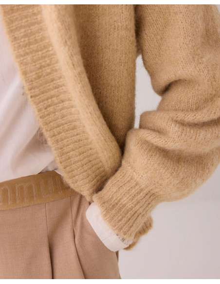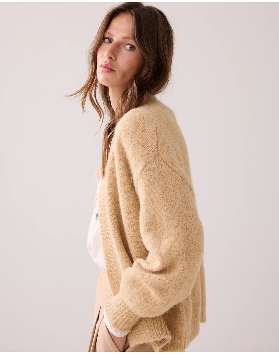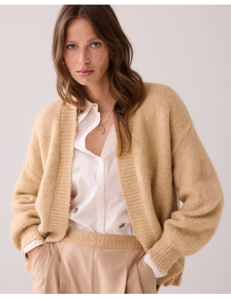 • Cárdigan abierto • Mangas abullonadas • Hilo suave • Puños acanalados