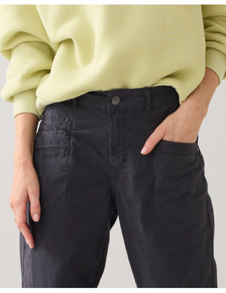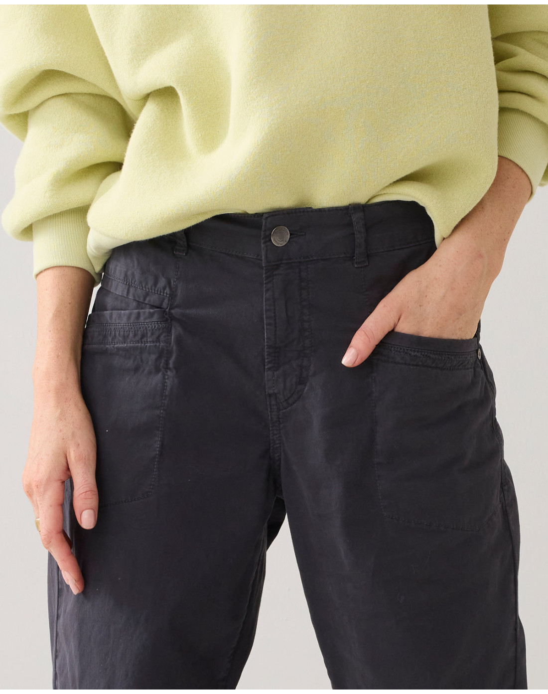 Estos pantalones de algodón de corte cónico tienen un acabado melocotón supersuave. Cuentan con bolsillos de ribete de patchwork con pespuntes y bajo enrollado.