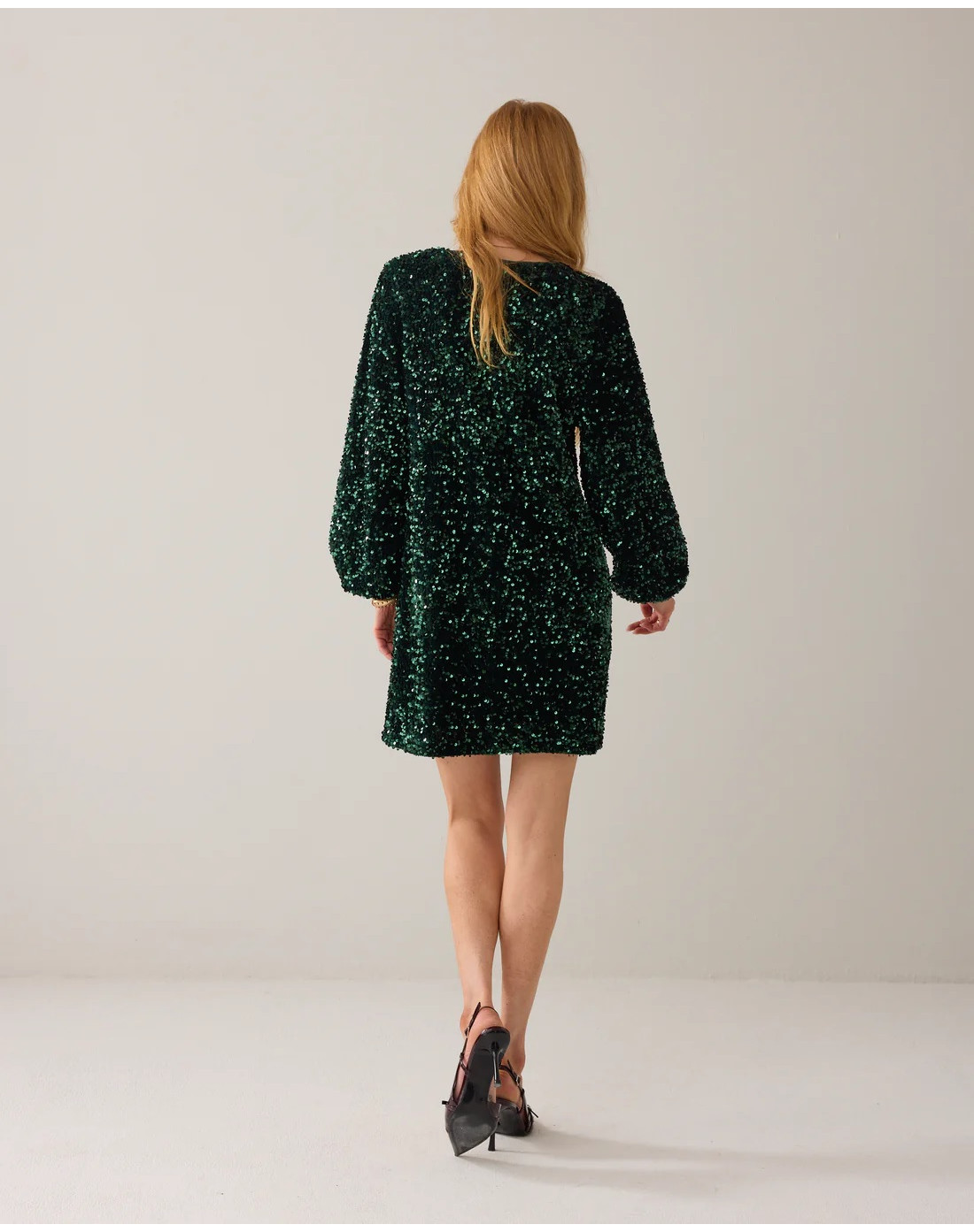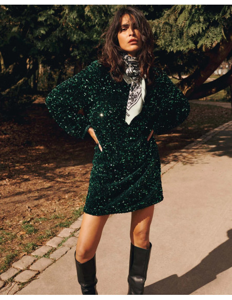 • Terciopelo elástico con lentejuelas • Puños de satén fruncido • Mangas largas abullonadas • Forro de viscosa