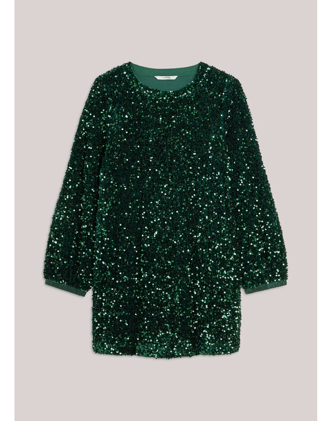 Vestido de terciopelo elástico con lentejuelas brillantes y ribete de satén fruncido. El vestido llega por encima de la rodilla y tiene cuello redondo. Es ligeramente ajustado en la parte superior y se ensancha sutilmente en el bajo.