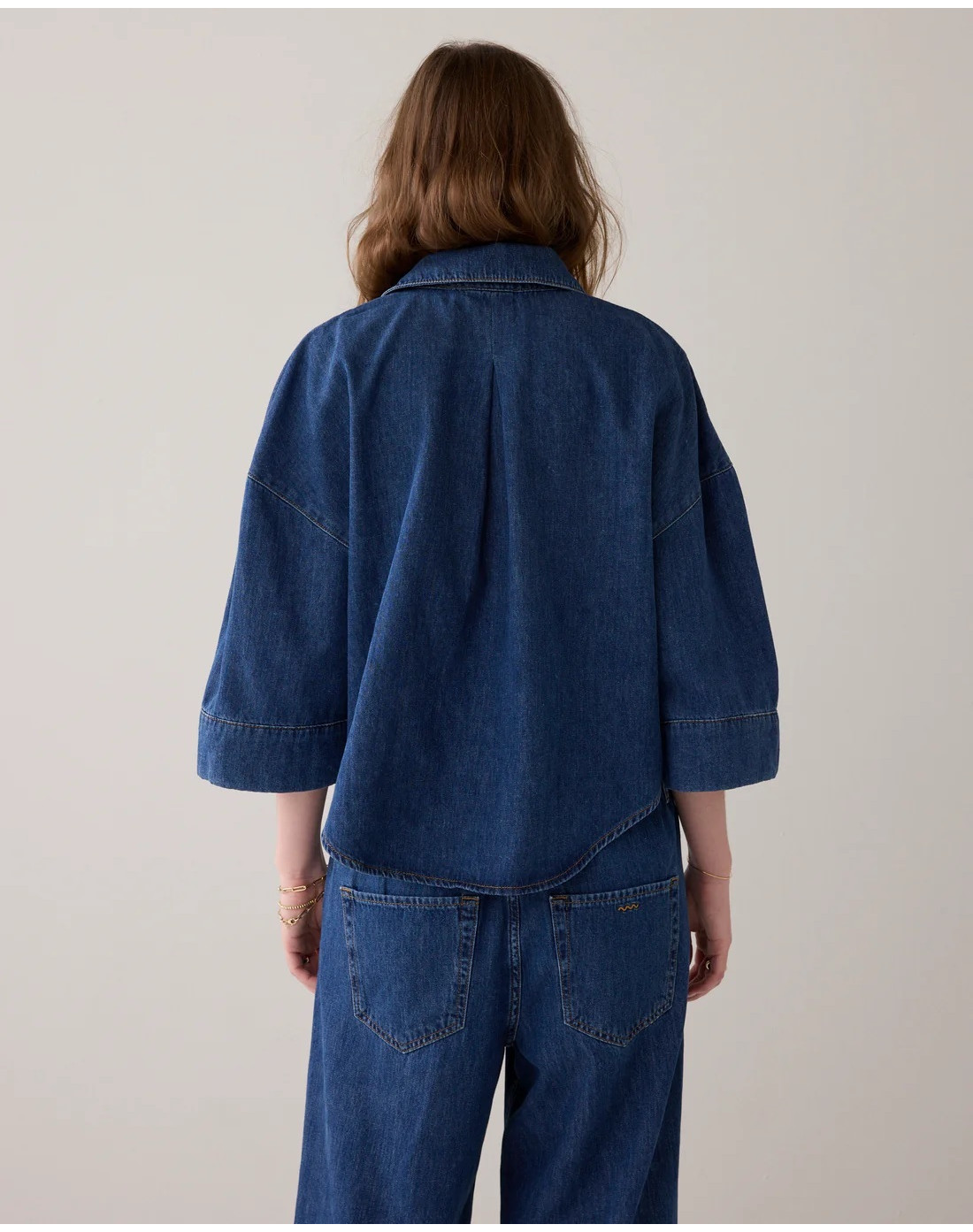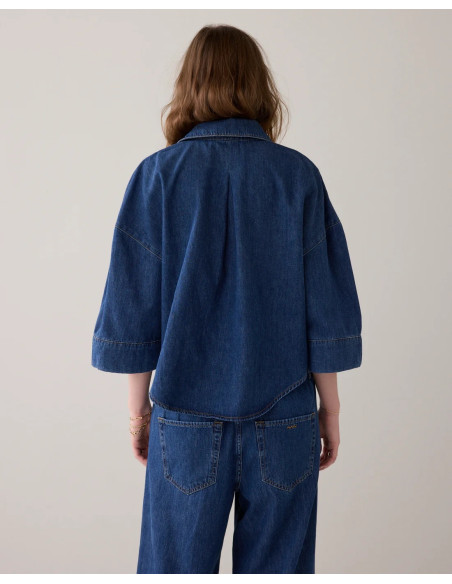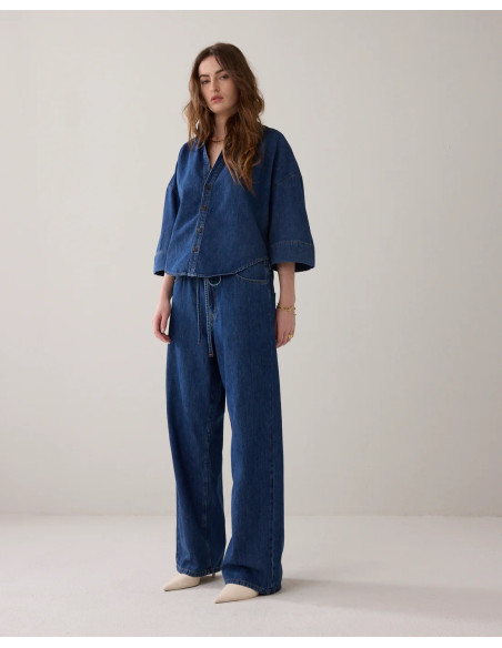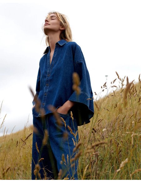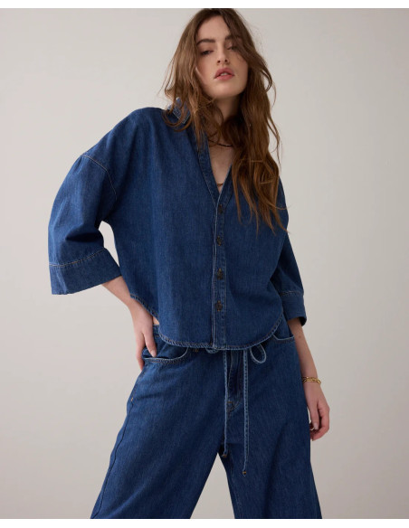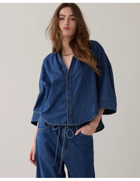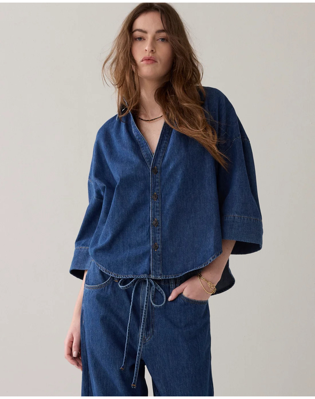 Blusa holgada en denim ligero y flexible con lavado a la piedra oscuro. La blusa tiene hombros caídos, mangas kimono anchas y rectas y escote en V con cierre de botones continuos. ¡Combínala con el pantalón a juego 4s2908!