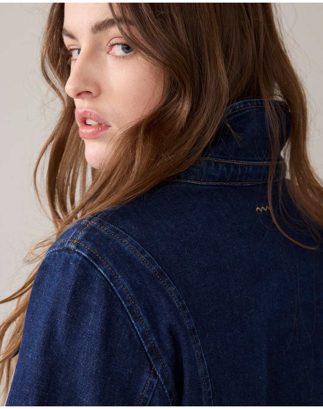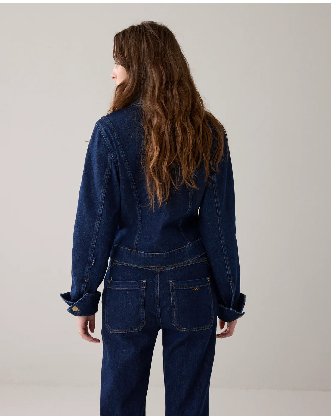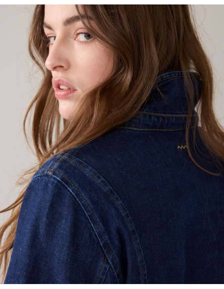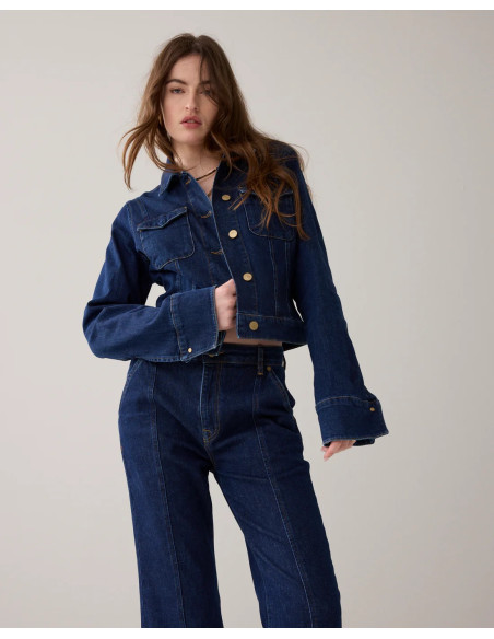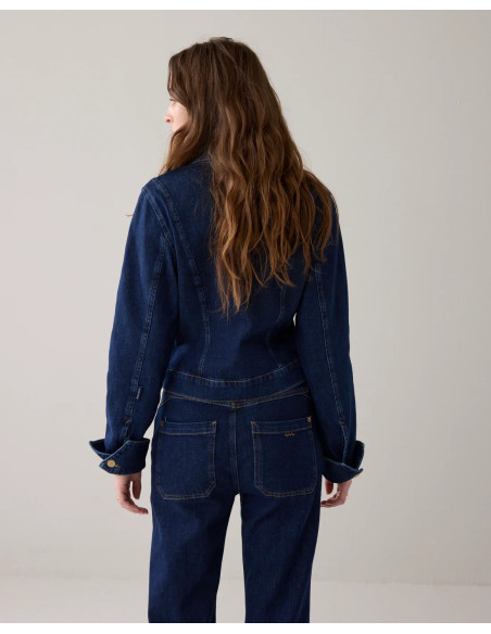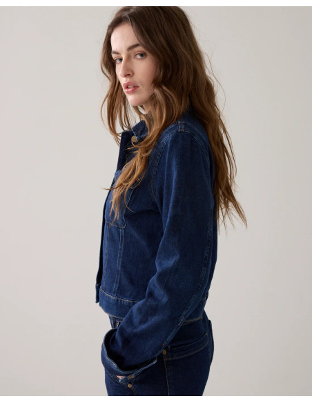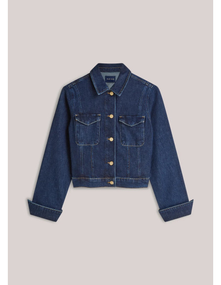 Chaqueta vaquera 100 % algodón con efecto lavado a la piedra oscuro (denim envejecido). La chaqueta tiene un corte entallado y bolsillos en el pecho con solapa y botones metálicos a presión.