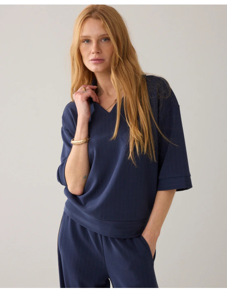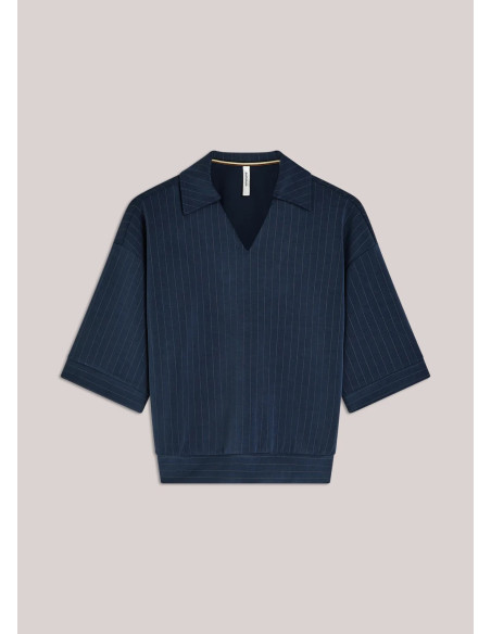 Top de neopreno suave de raya diplomática en un tejido flexible: nuestro tejido más vendido de la colección de otoño. El polo tiene un corte cuadrado con bajo ajustado a la cadera, cuello polo con una pequeña abertura y mangas midi con hombros al descubierto.
